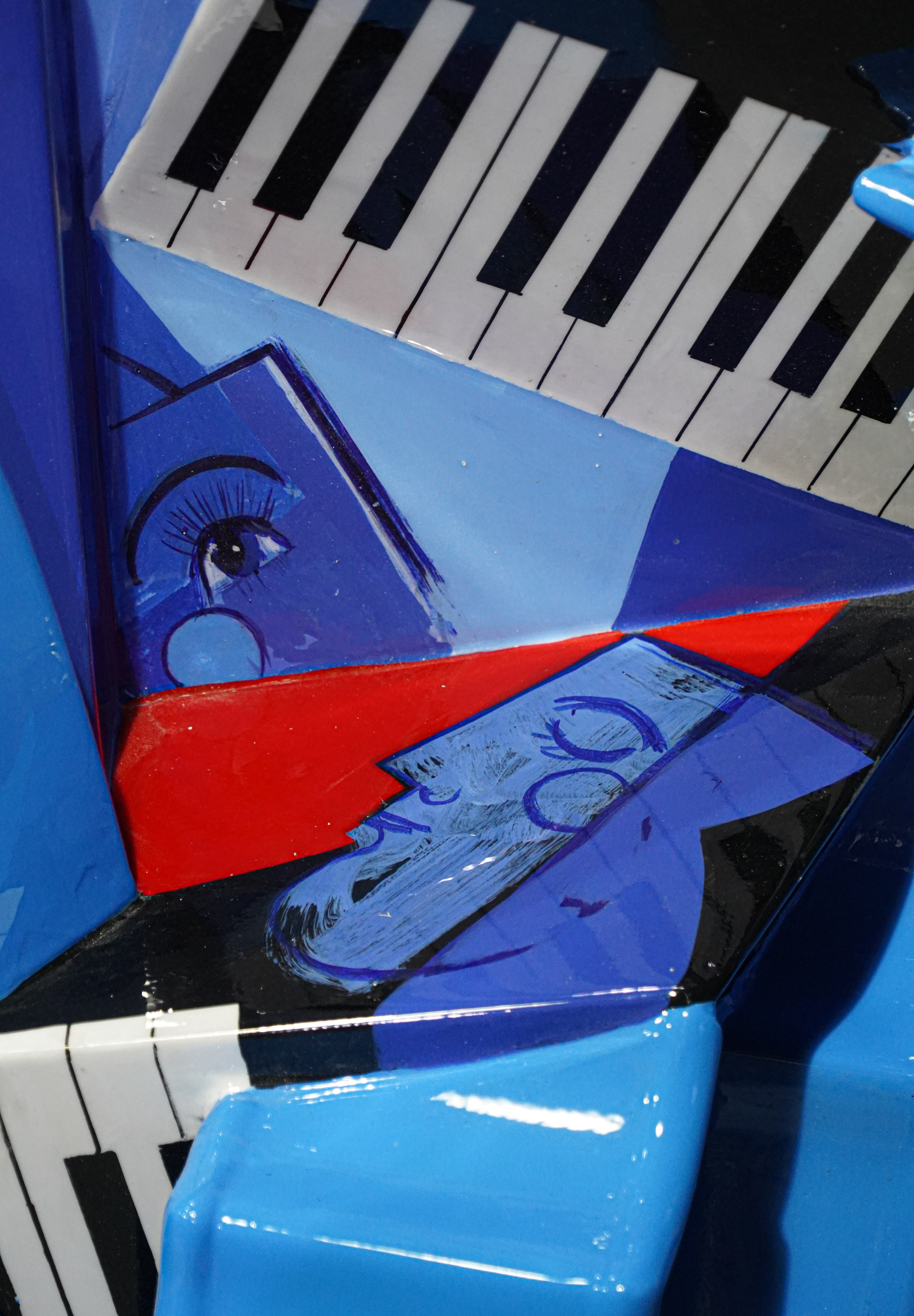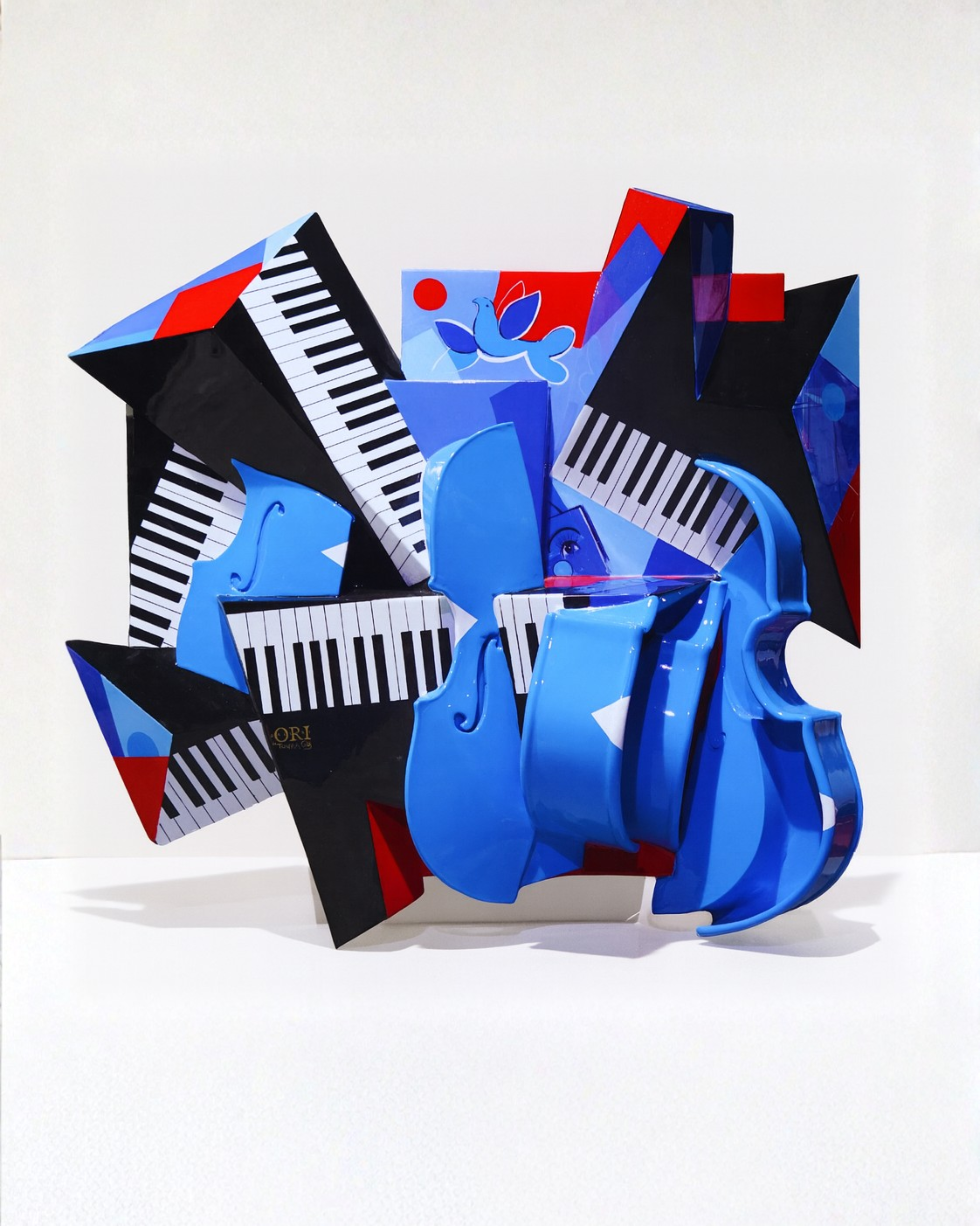 Through sculpted depth and painted illusion, Tovia transforms the remnants of a piano into a symbol of restoration — suggesting that even what is broken can still sing. A dove in flight and a single, watchful eye emerge from the composition, embodying both the ache and resilience of the human spirit.