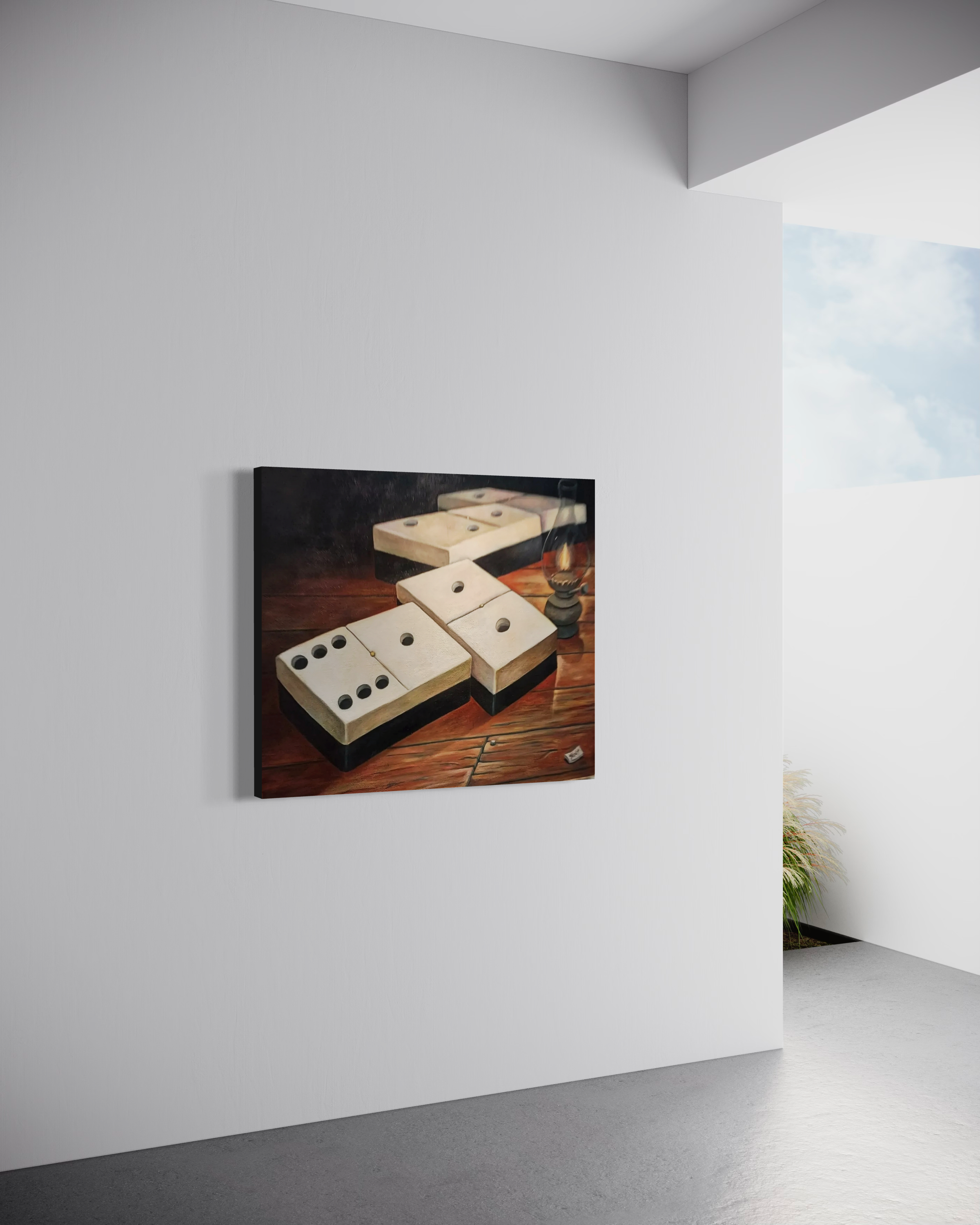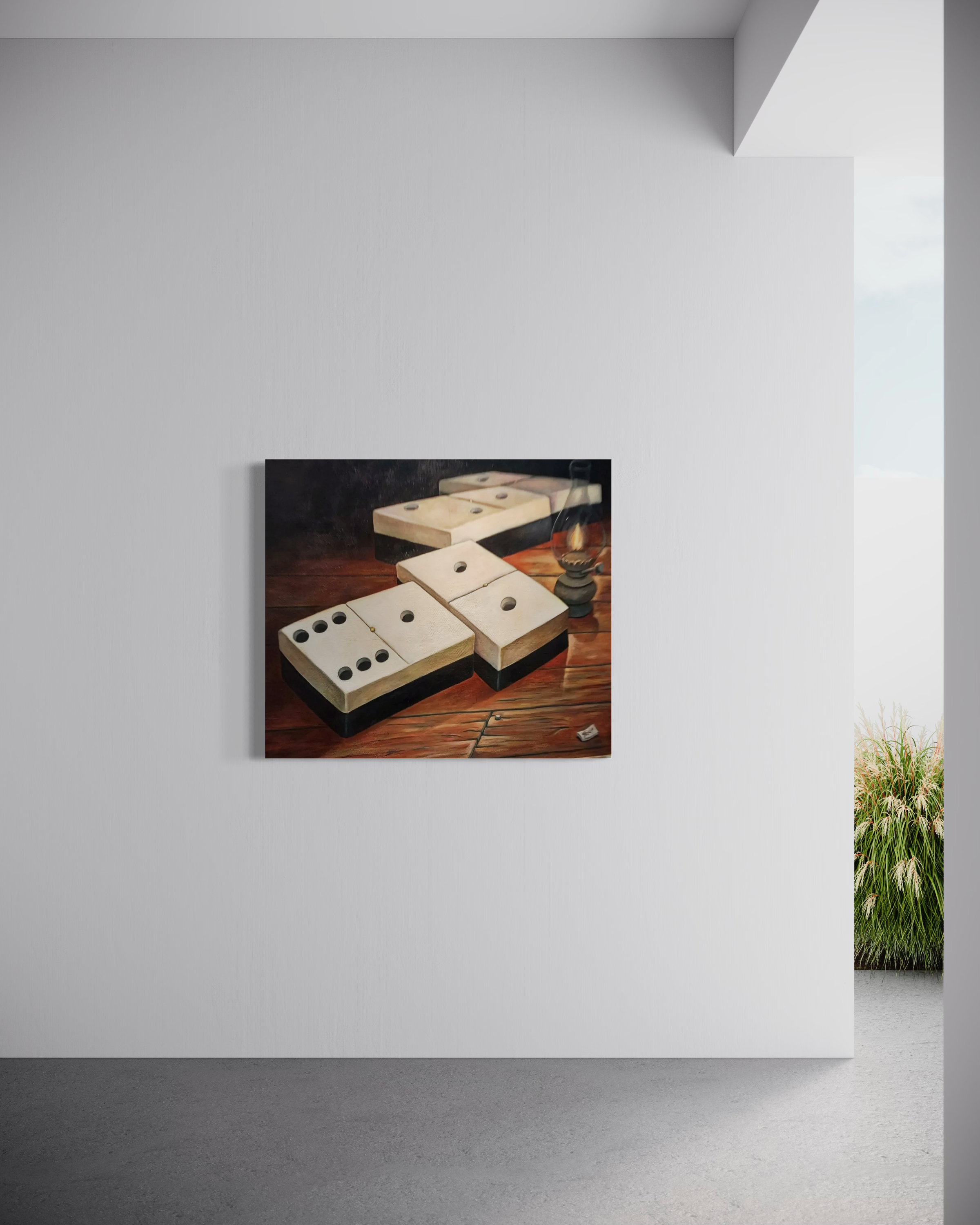 In Dominoes, Alberto Godoy transforms a familiar game into a poetic still life filled with nostalgia and quiet drama. Each tile is rendered with an almost sculptural solidity, casting deep shadows across the warm textured wood beneath. The soft glow of an oil lantern to the side hints at a bygone era, an evening suspended in time where the air is still and stories are shared in silence.