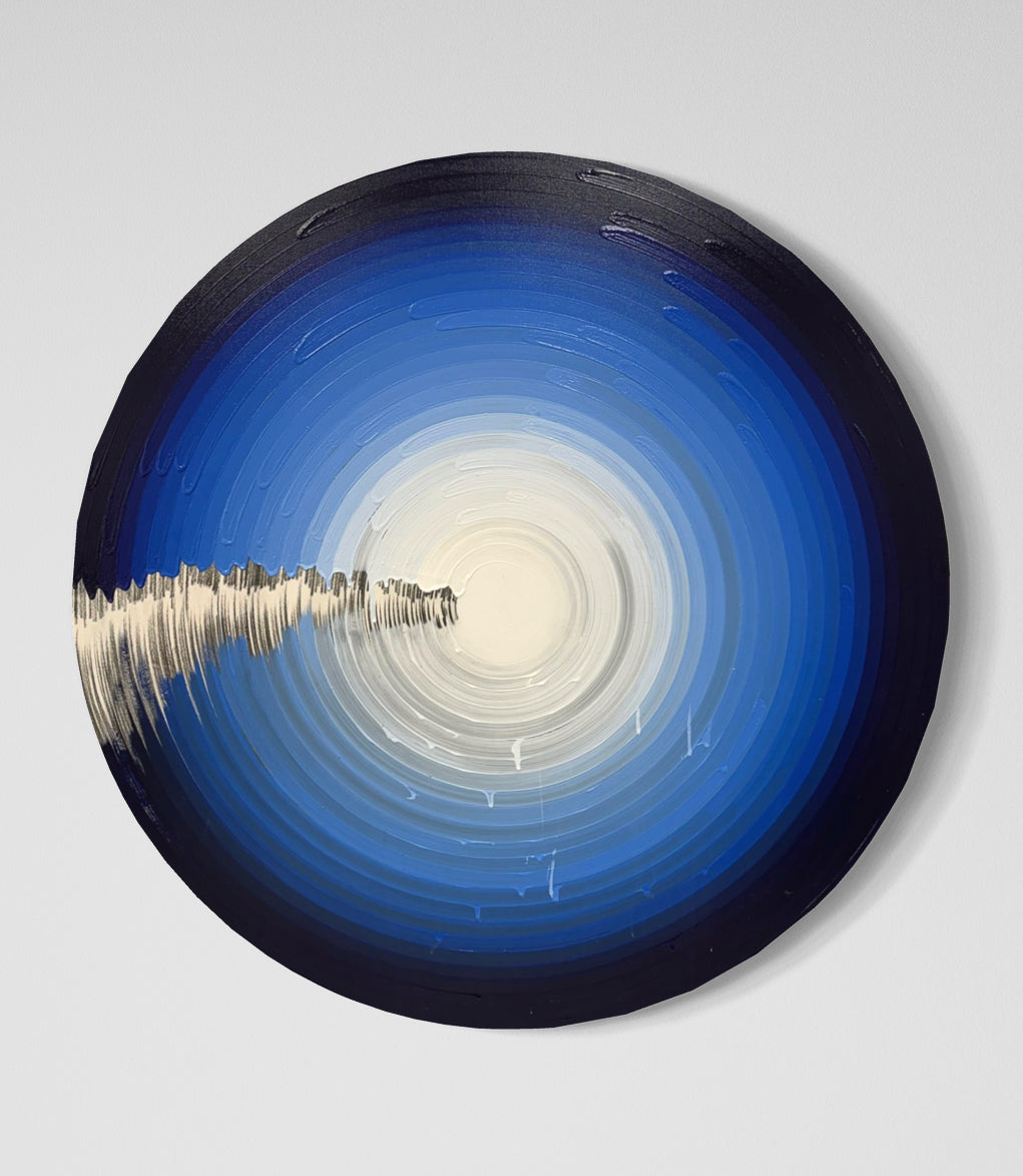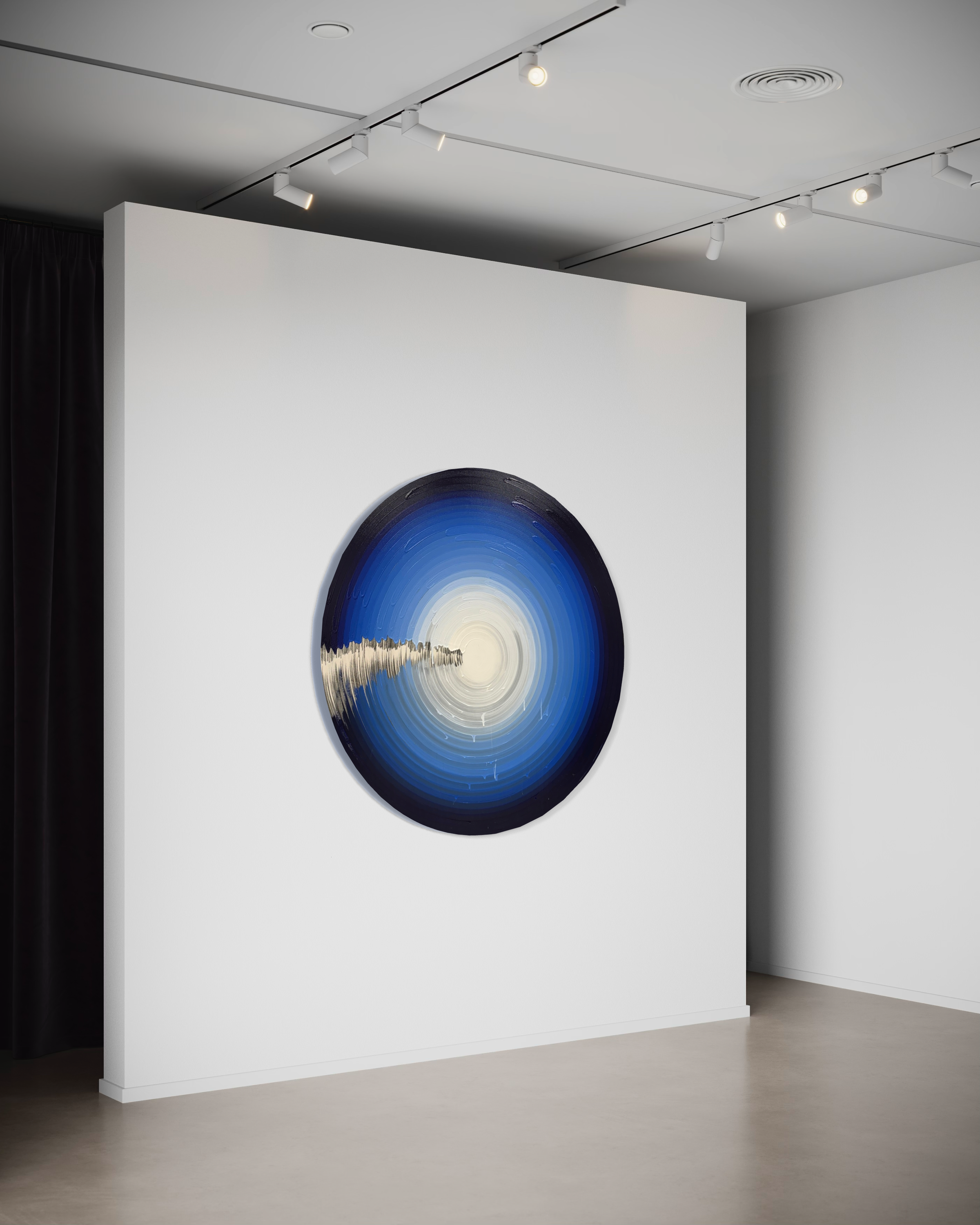 A mesmerizing visual poem, a celestial whirlpool of color and silence, where light meets shadow in a dance of cosmic intimacy. Rendered in hypnotic concentric strokes, the piece draws the viewer into a deep, meditative spiral that echoes the movement of planets, tides, and breath itself.
