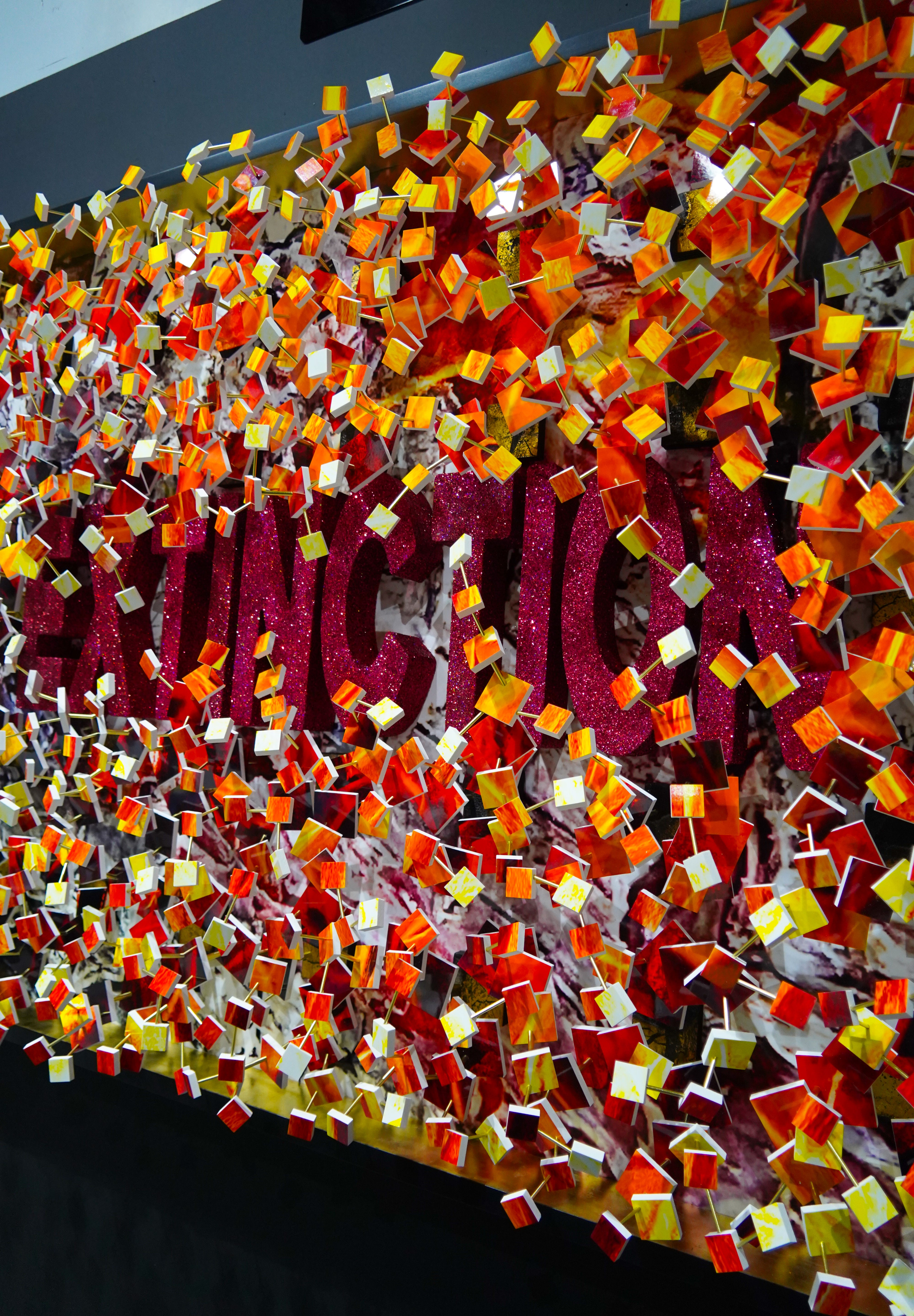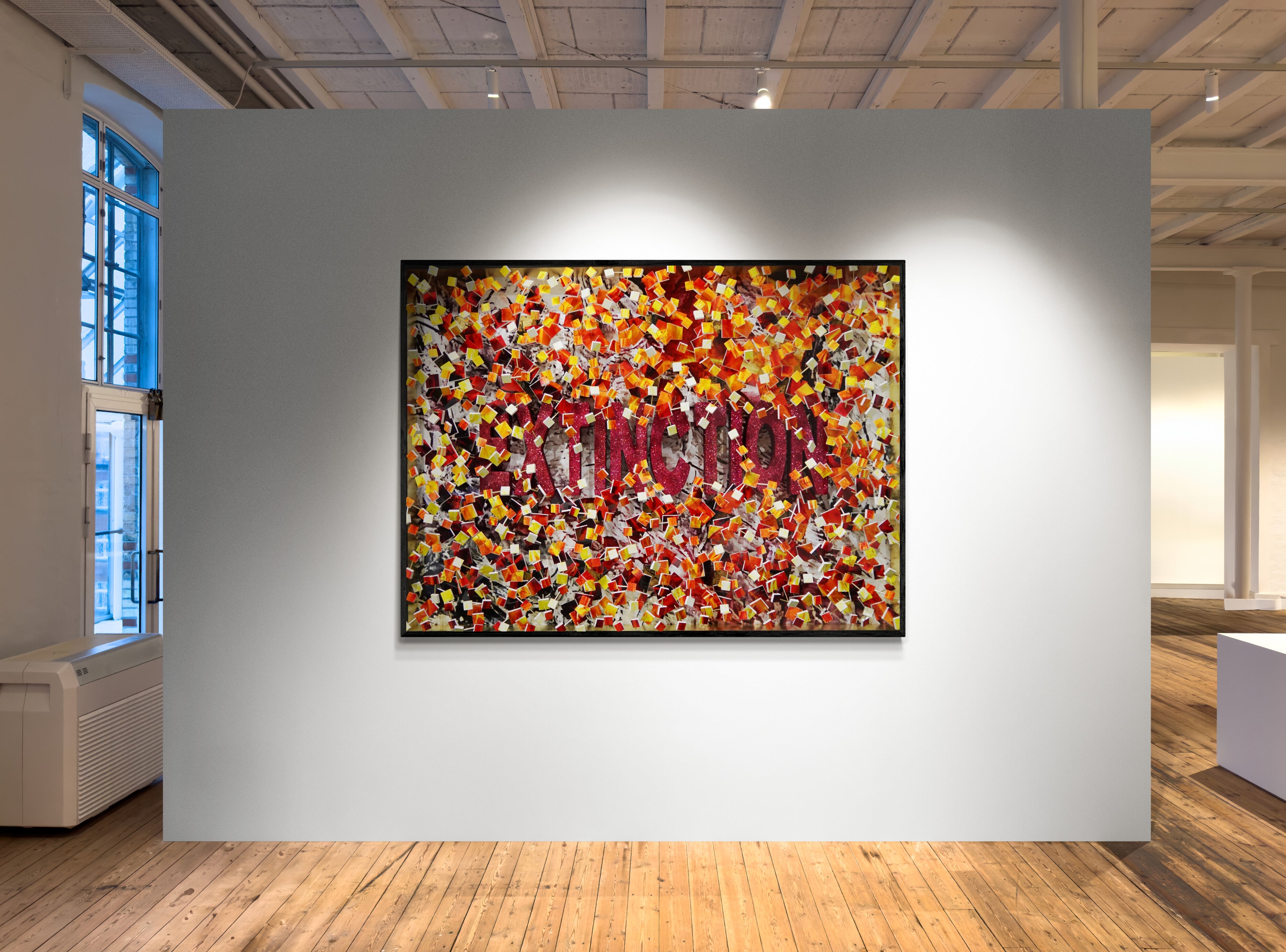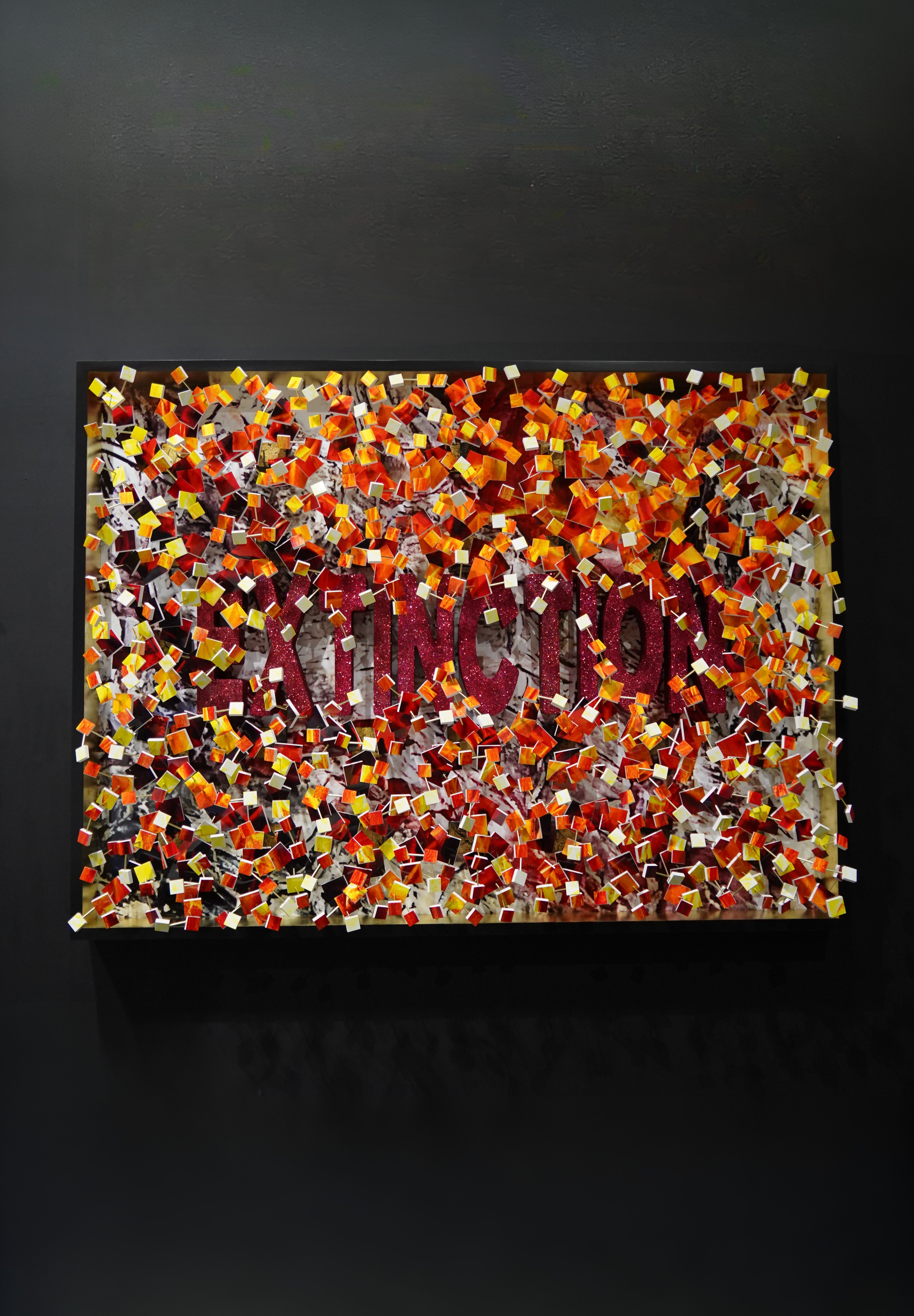 Extinction is a powerful meditation on disappearance and the irreversible tipping points we often fail to see until it's too late. The word “extinction” emerges from a dense cascade of fiery red, orange, and yellow fragments, like embers suspended in the air, partially veiled by the chaos unfolding around it. The scattered pieces suggest both destruction and what’s left behind, echoing the fragmentation of ecosystems, species, and memory. This piece draws attention to the overwhelming noise of modern life that can obscure critical truths. It is a visual warning and a call to awareness, reminding us that what vanishes may never return.