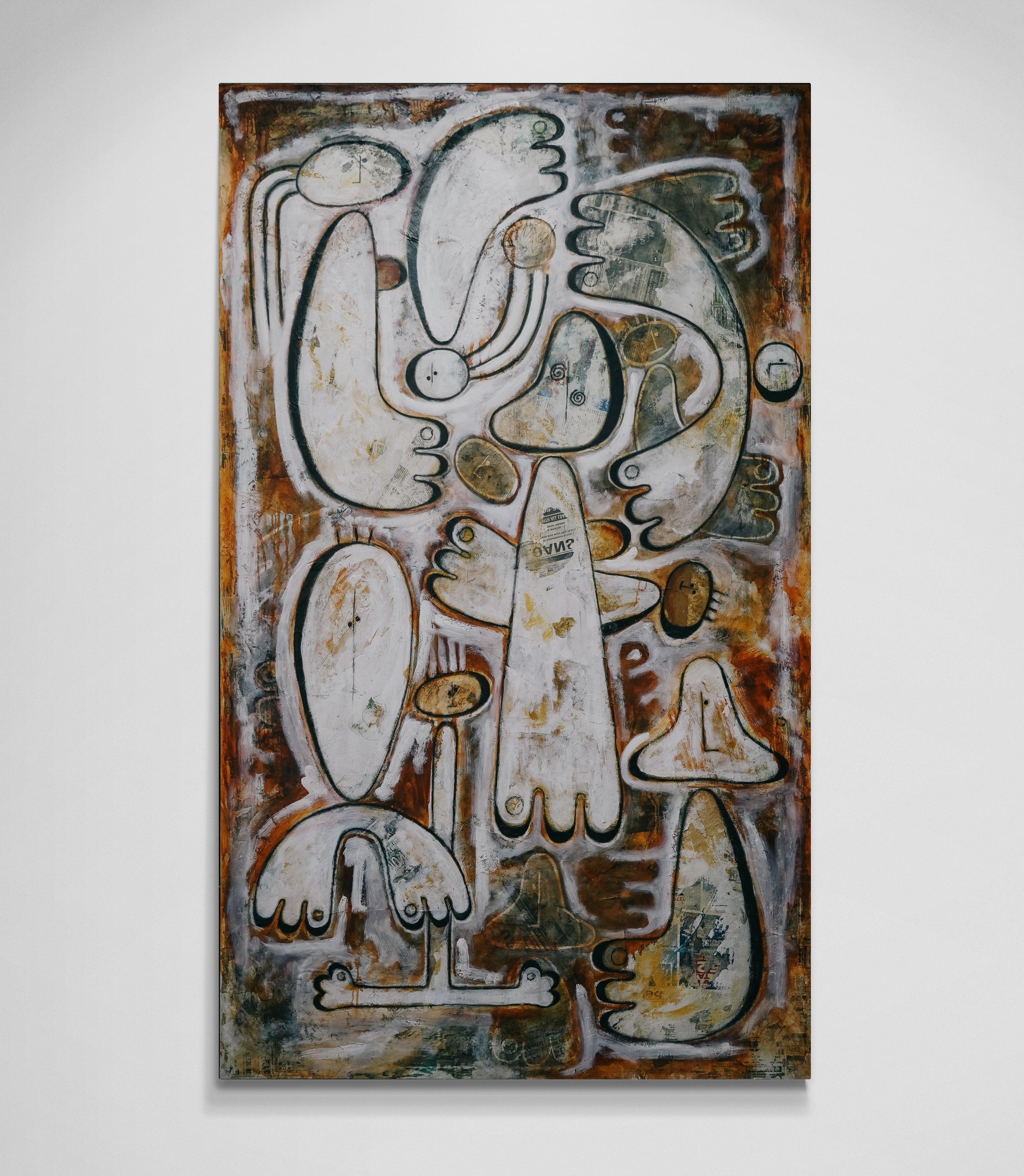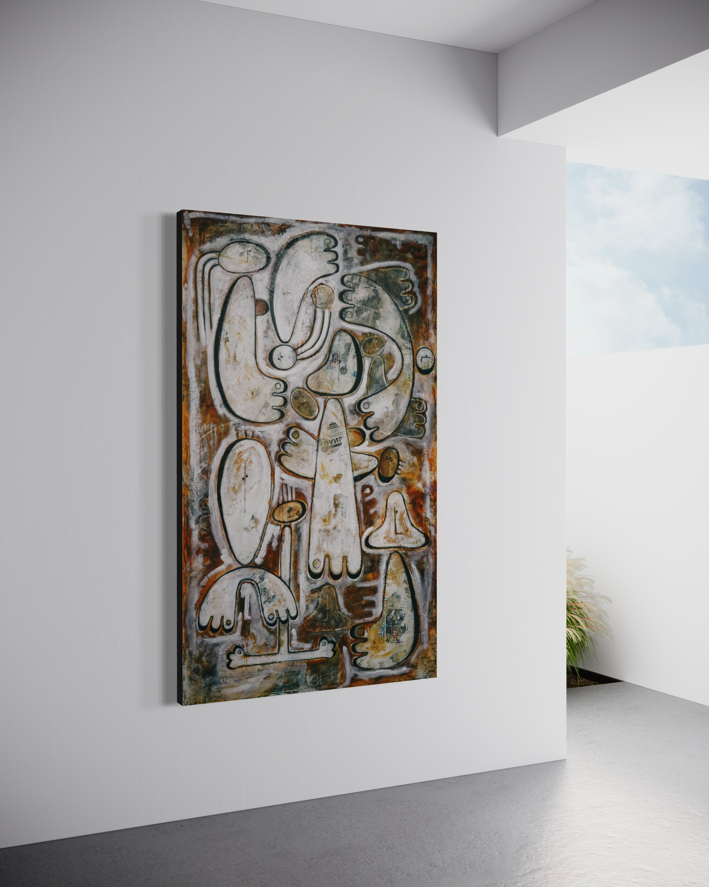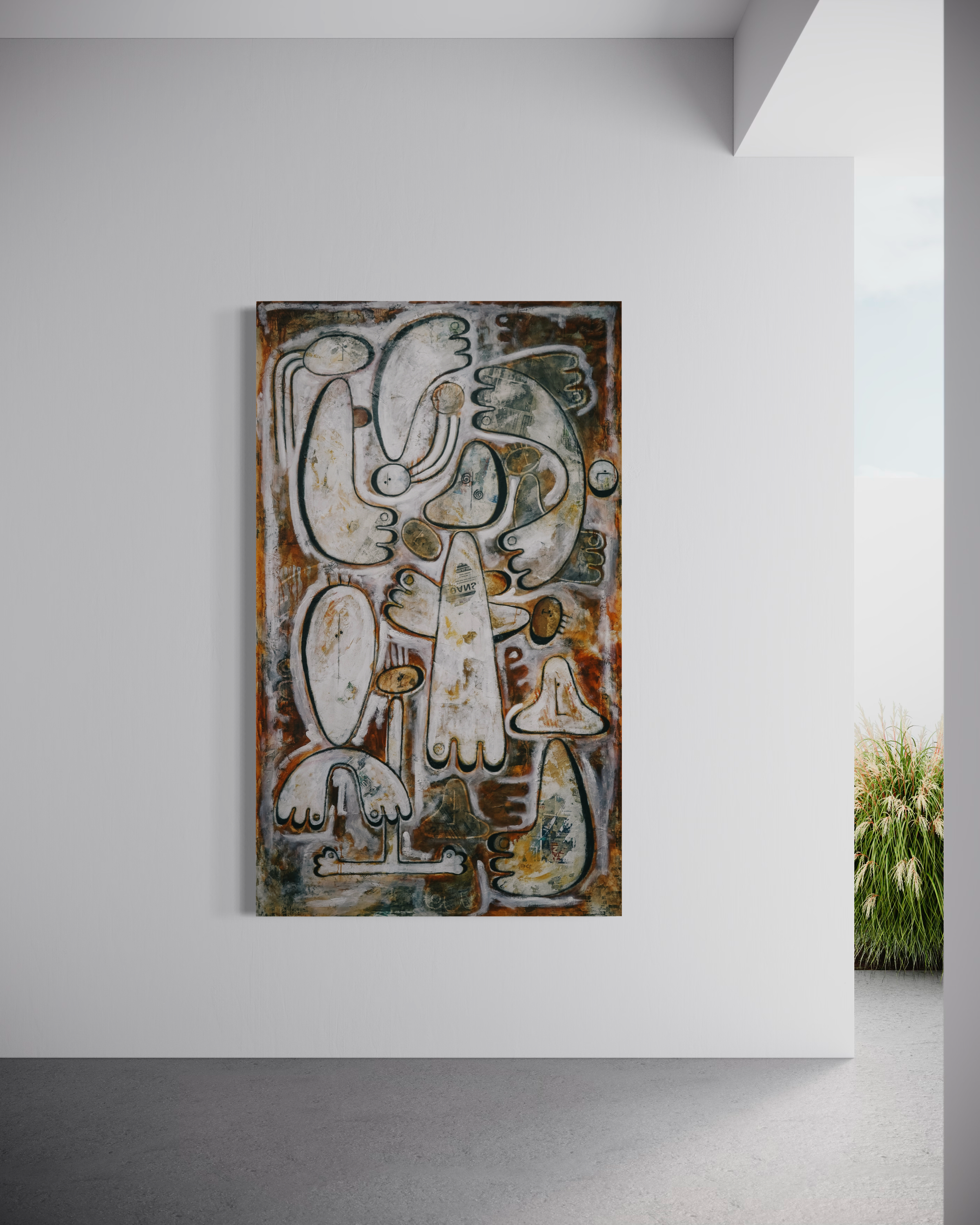 An original, one of one, hand signed, mixed-media on canvas piece (oil and newspaper collage) by infamous Cuban artist Alberto Godoy, created in 2021. A striking composition that dances between abstraction and primal expression, inviting the viewer into a dreamscape where form and gesture dissolve into raw symbolism. The piece, rendered in layered hues of rust, ochre, and ivory, is dominated by a collection of ethereal, ghostlike figures. Faint traces of newspaper prints embedded within the paint hint at a fusion of the spiritual and the mundane—modern life bleeding into archetypal myth. The scraped and weathered surface lends a tactile, almost archaeological quality, as if the painting were a rediscovered relic whispering lost stories.