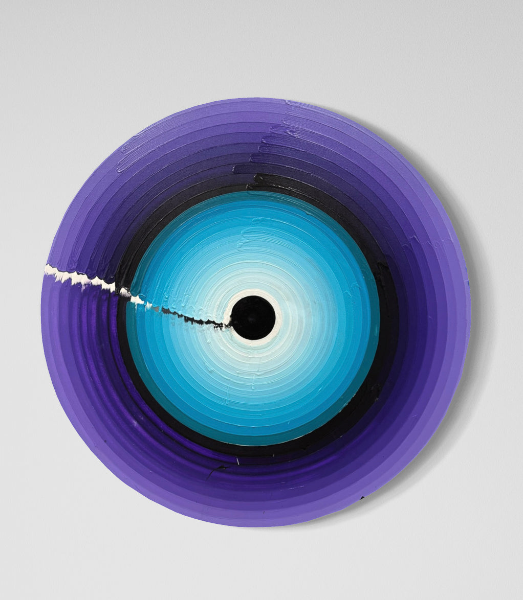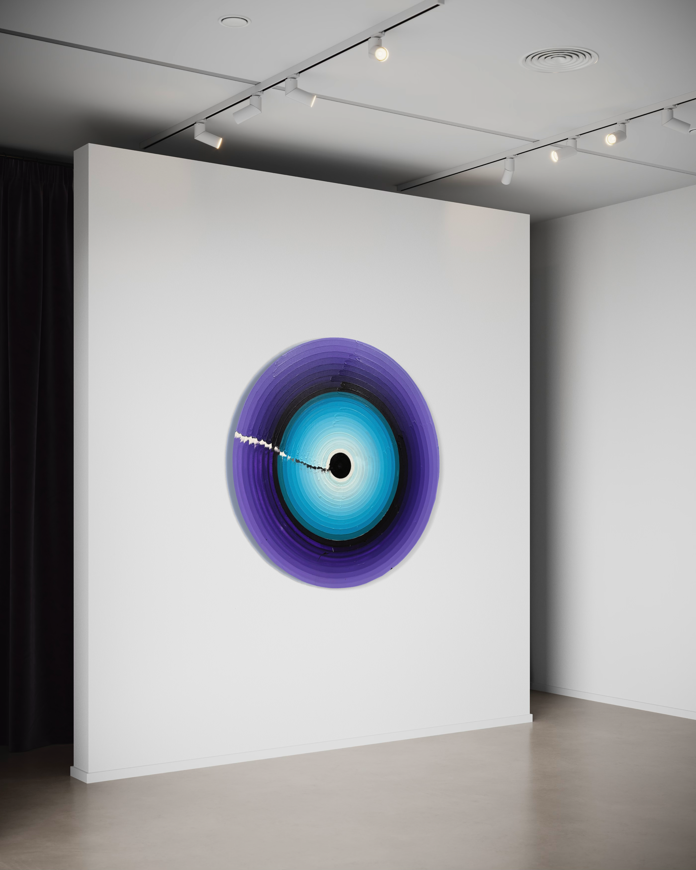 A mesmerizing lens into the cosmic unknown, a hypnotic fusion of precision and mystery that invites the viewer to contemplate the boundless nature of existence. Composed in flawless concentric circles, the work radiates from a jet-black core outward through icy whites, tranquil aquas, and rich violets, forming a perfect vortex of color, time, and space.