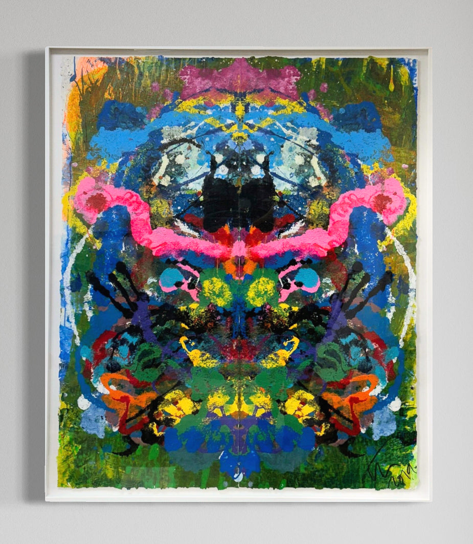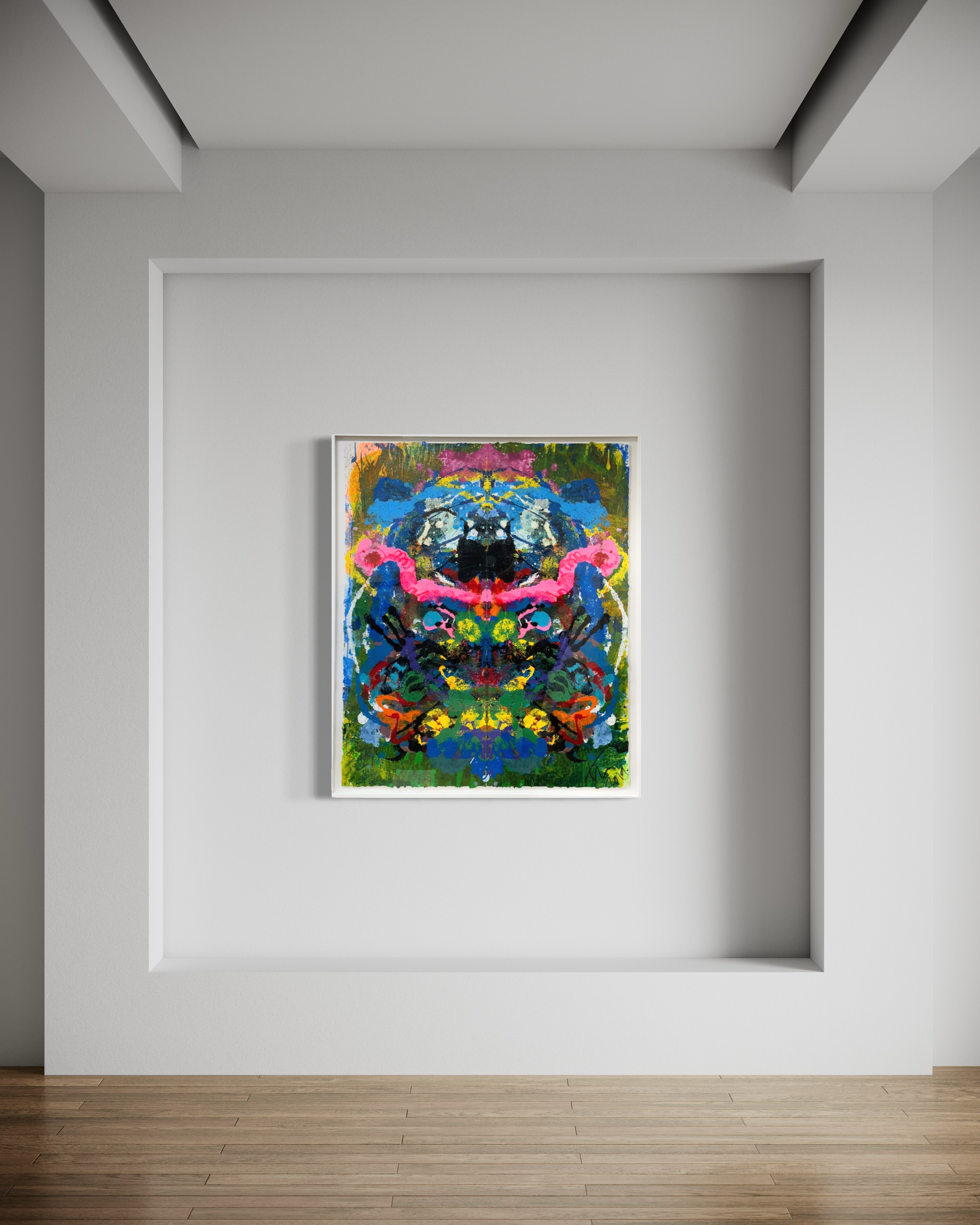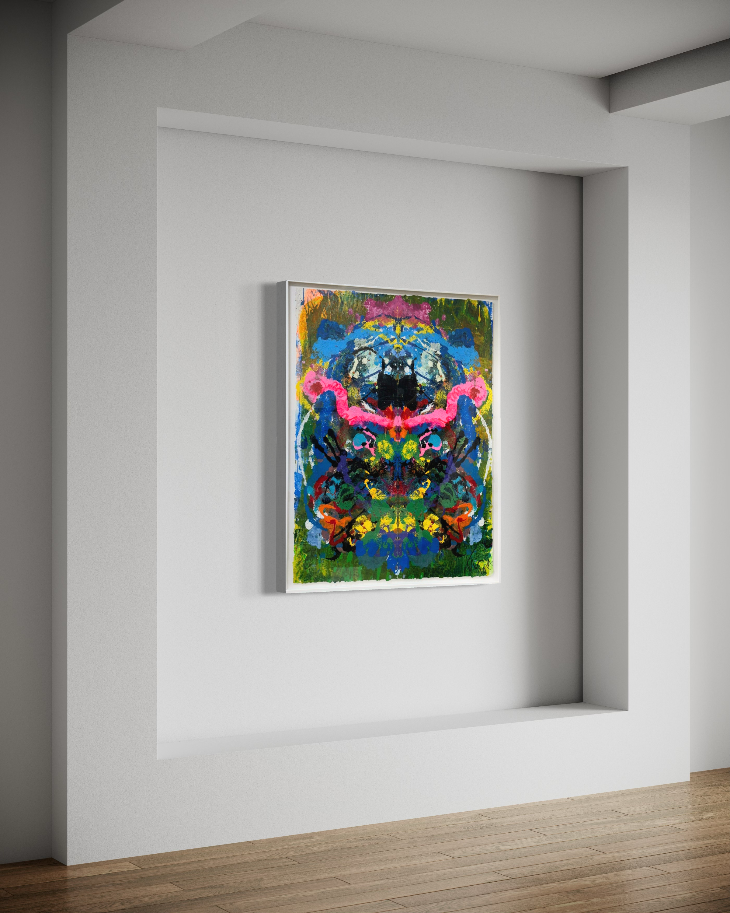 A kaleidoscopic eruption of self-discovery, a visual journey into the soul’s wild terrain where identity, memory, and spirit collide in radiant clarity. The composition, rendered in vibrant symmetry, pulses with the sensation of something powerful stirring from within, as if consciousness itself is blooming through layers of hidden color. At the center, a dense black shape suggests the unknown self, both masked and mirrored, holding the mystery that each of us carries.