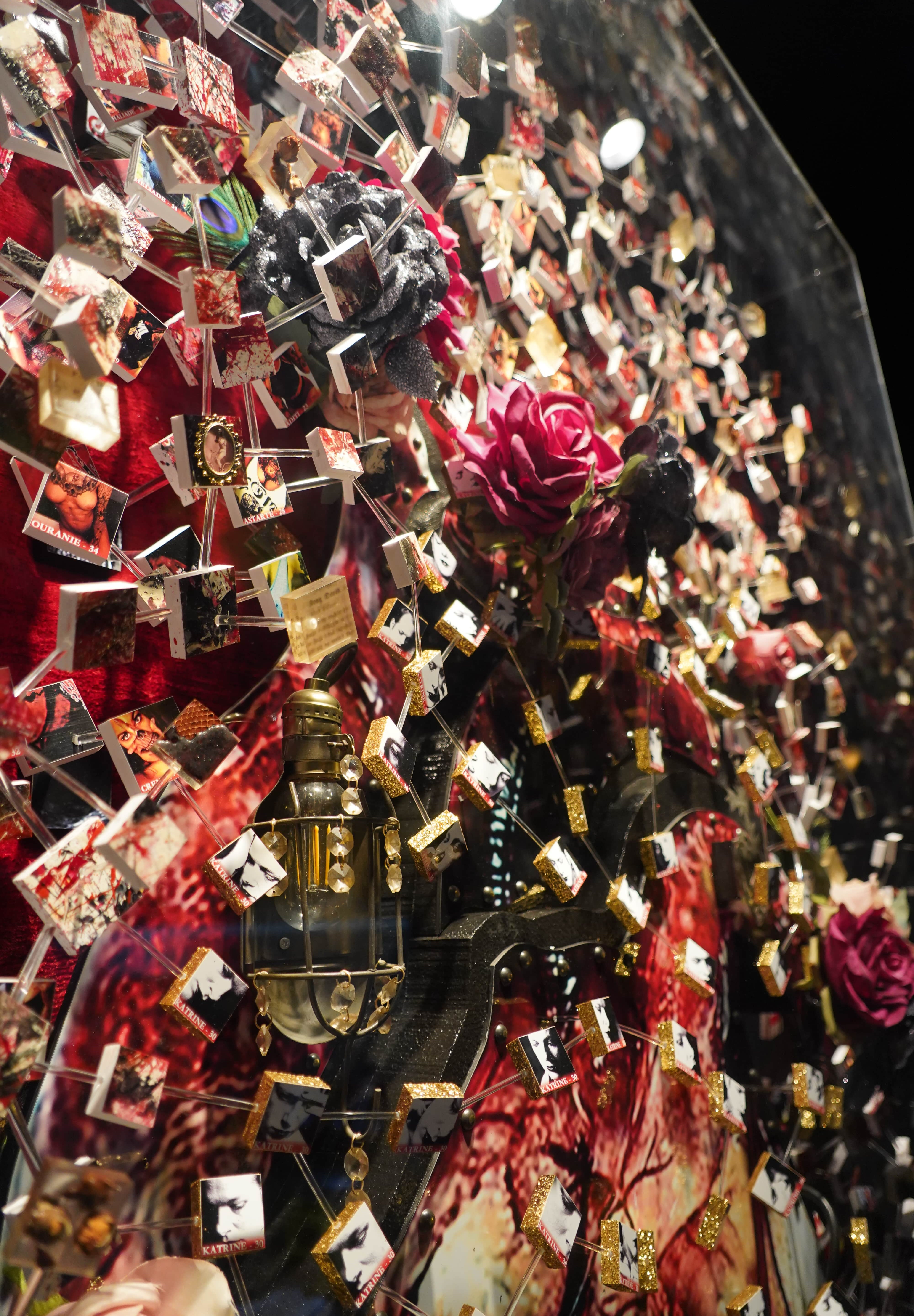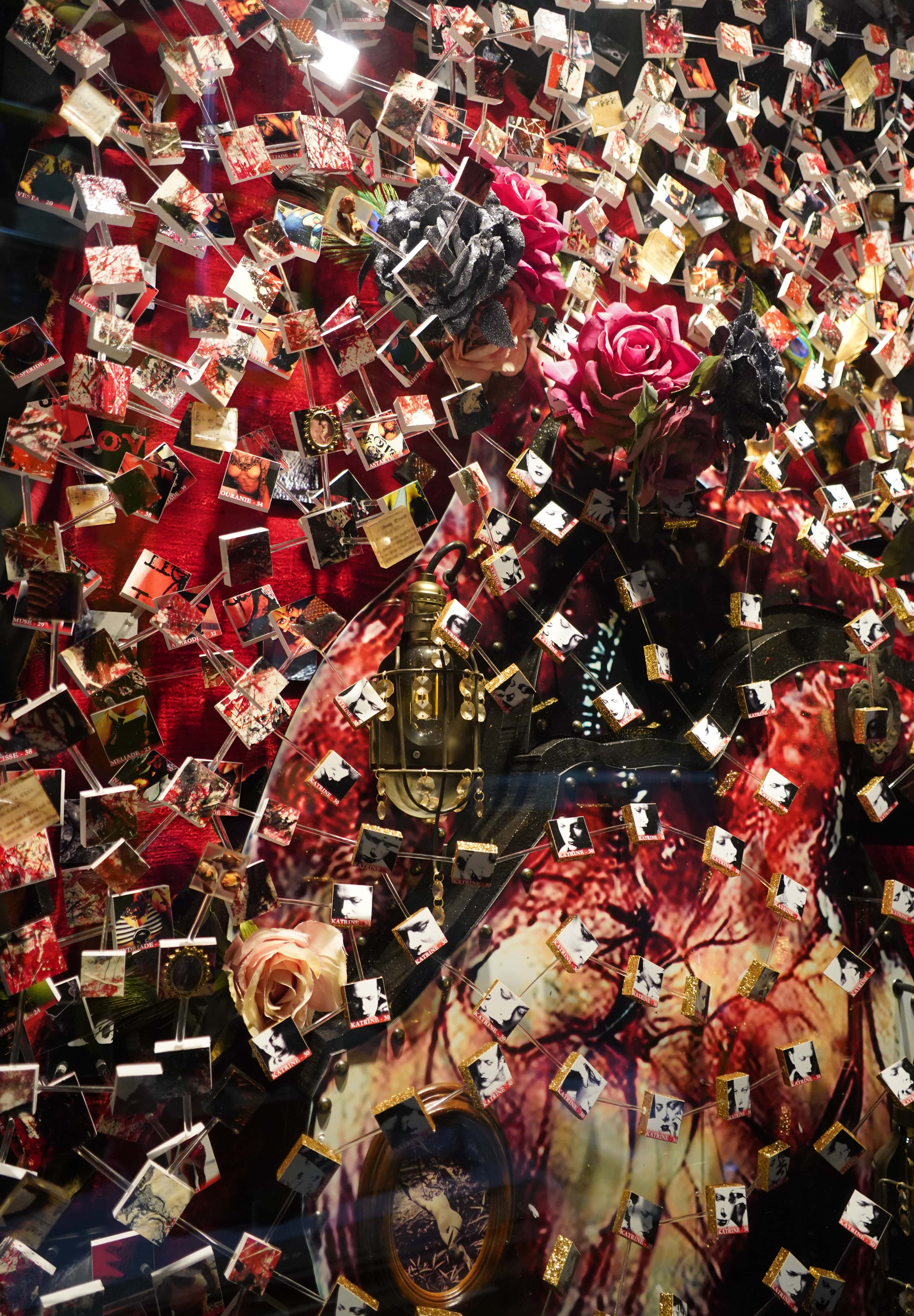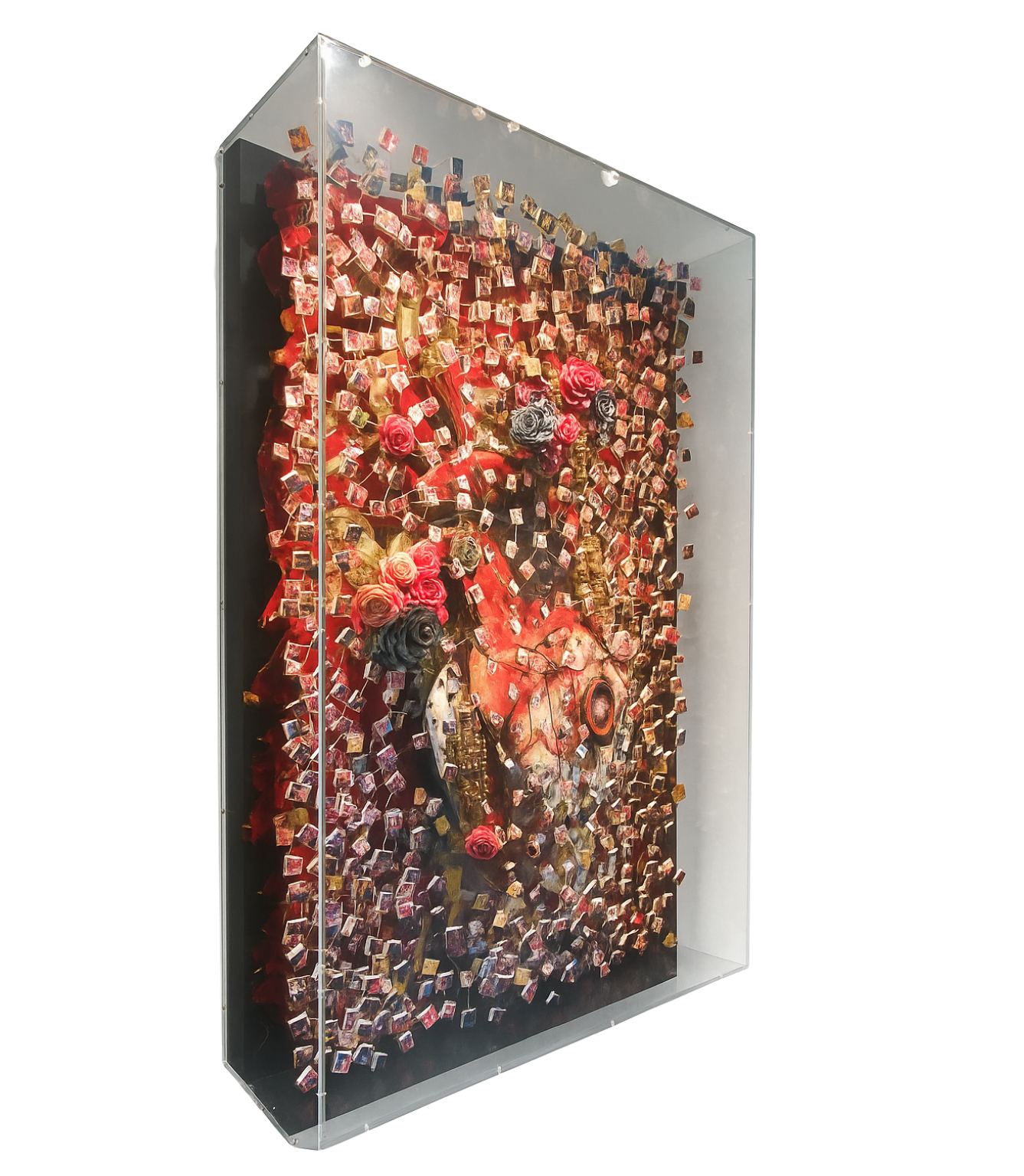 The artist reflects on the theme of obsession, particularly his fascination with tattooed and pierced women, which he encountered through a meeting website. This personal fixation connects to the broader concept of bodily consumption, symbolized through the central motif of a human heart in his work. The piece invites collectors to fully immerse themselves in his world, incorporating elements such as tattoos, roses, and burning velvet, all of which evoke a sense of intensity and allure.