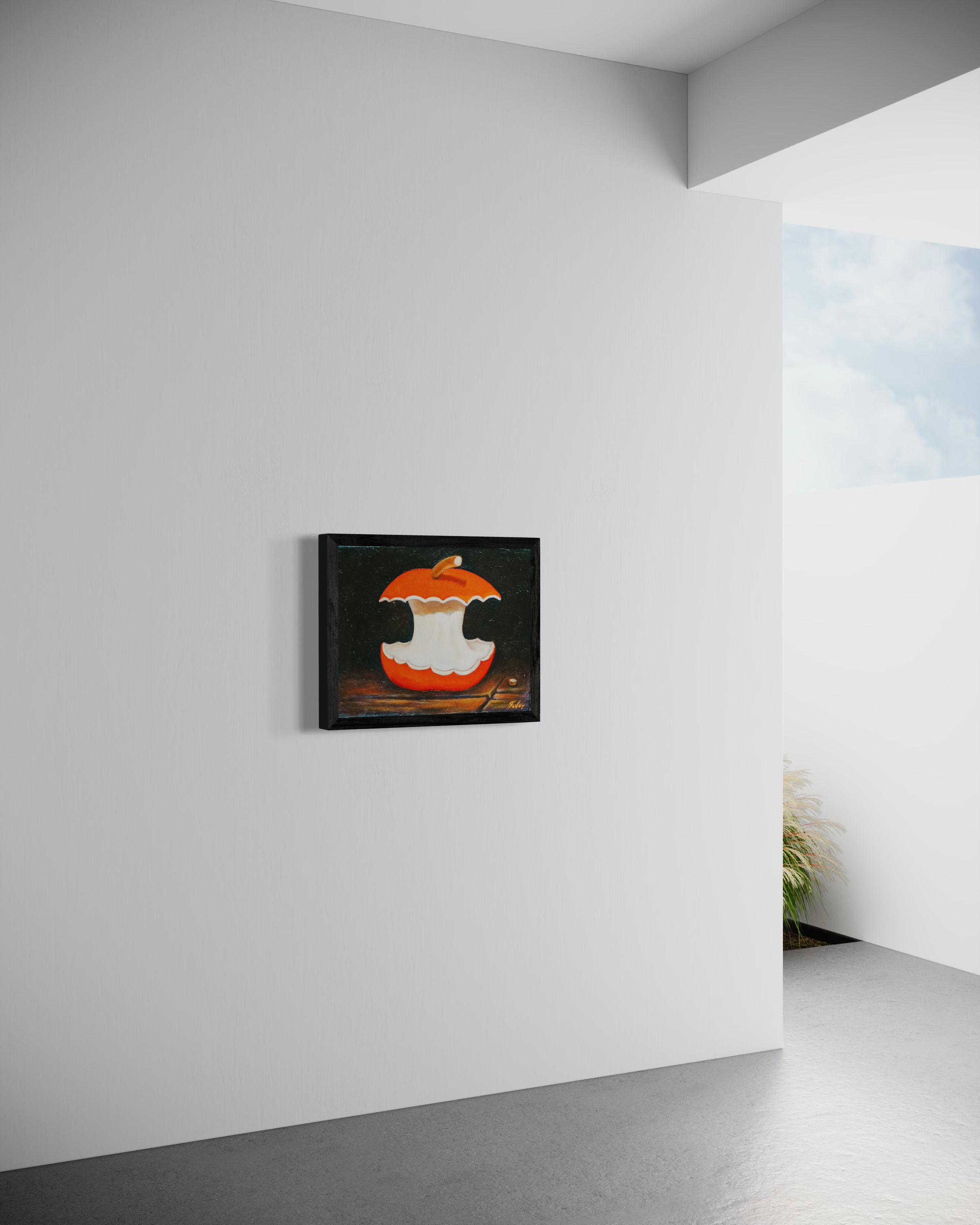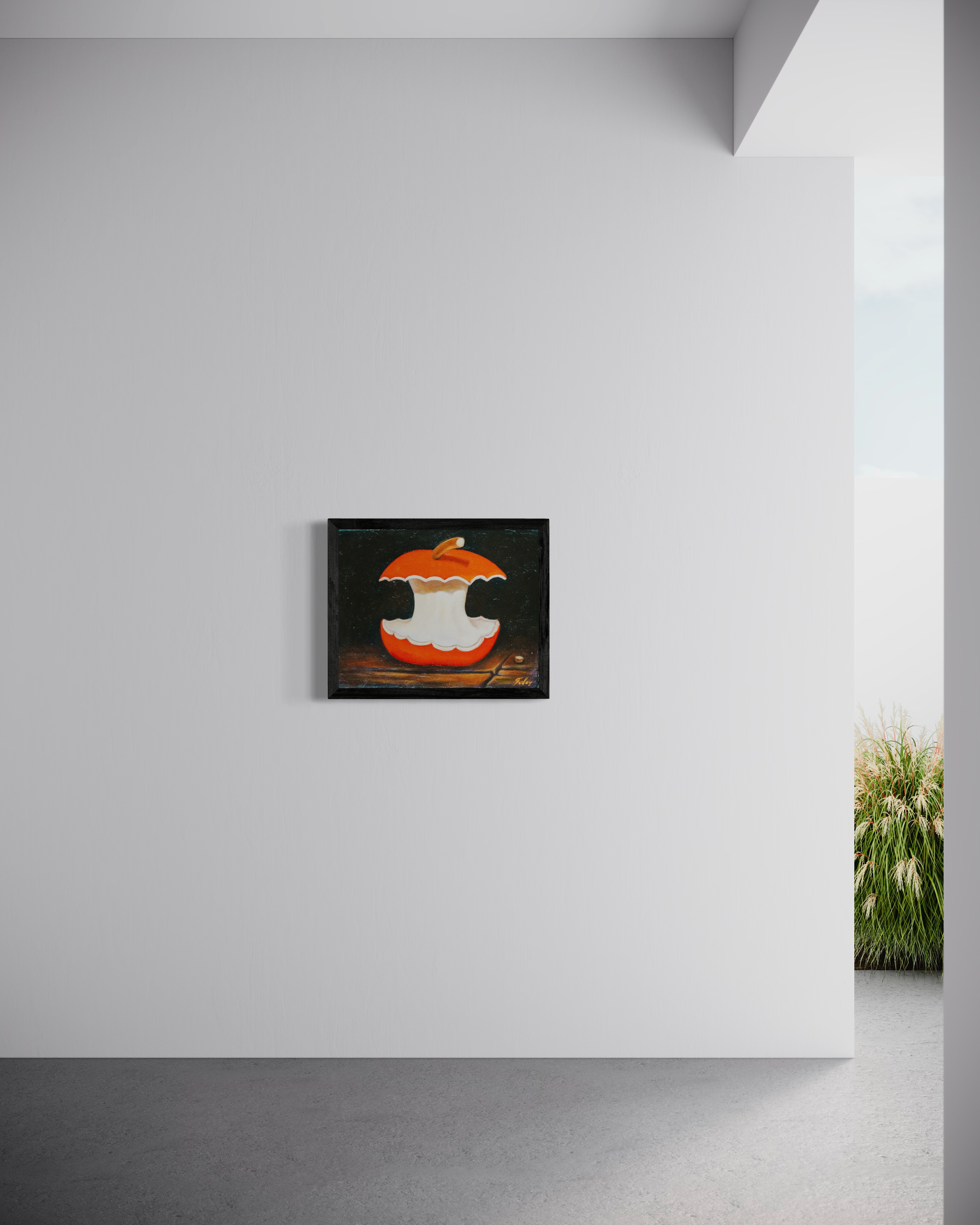 This captivating painting transforms a simple apple into a surreal and whimsical vision. The fruit is carved with scalloped edges, creating an almost ornamental core that radiates both elegance and playfulness. Set against a dark, textured background, the vibrant orange-red skin glows warmly, while the creamy white interior contrasts in a way that feels both inviting and dreamlike. Subtle details, like the perfectly placed stem and the small seed resting nearby, add to the charm and narrative of the composition. The piece evokes a sense of wonder, turning an everyday object into an imaginative work of art that celebrates beauty in simplicity.