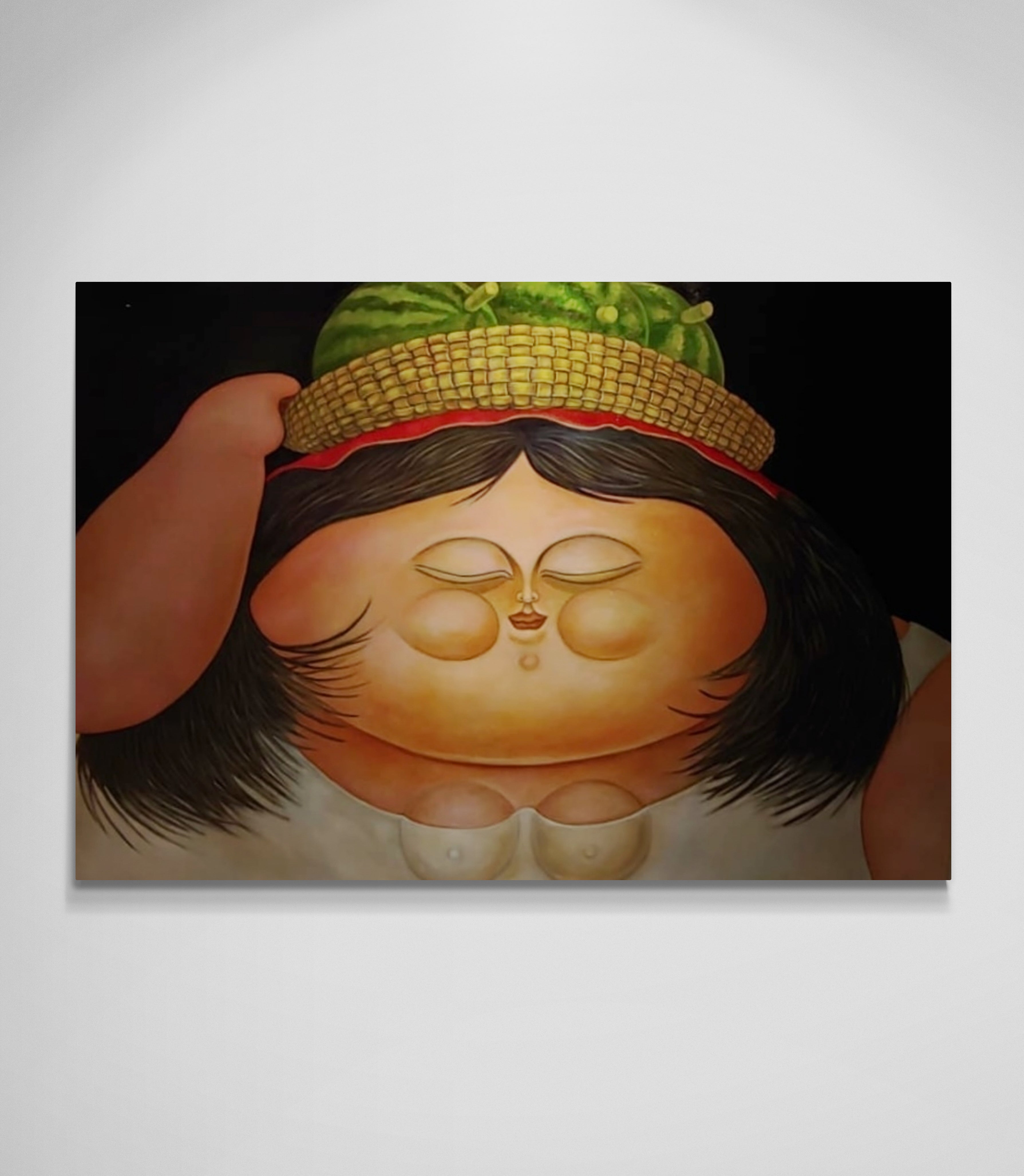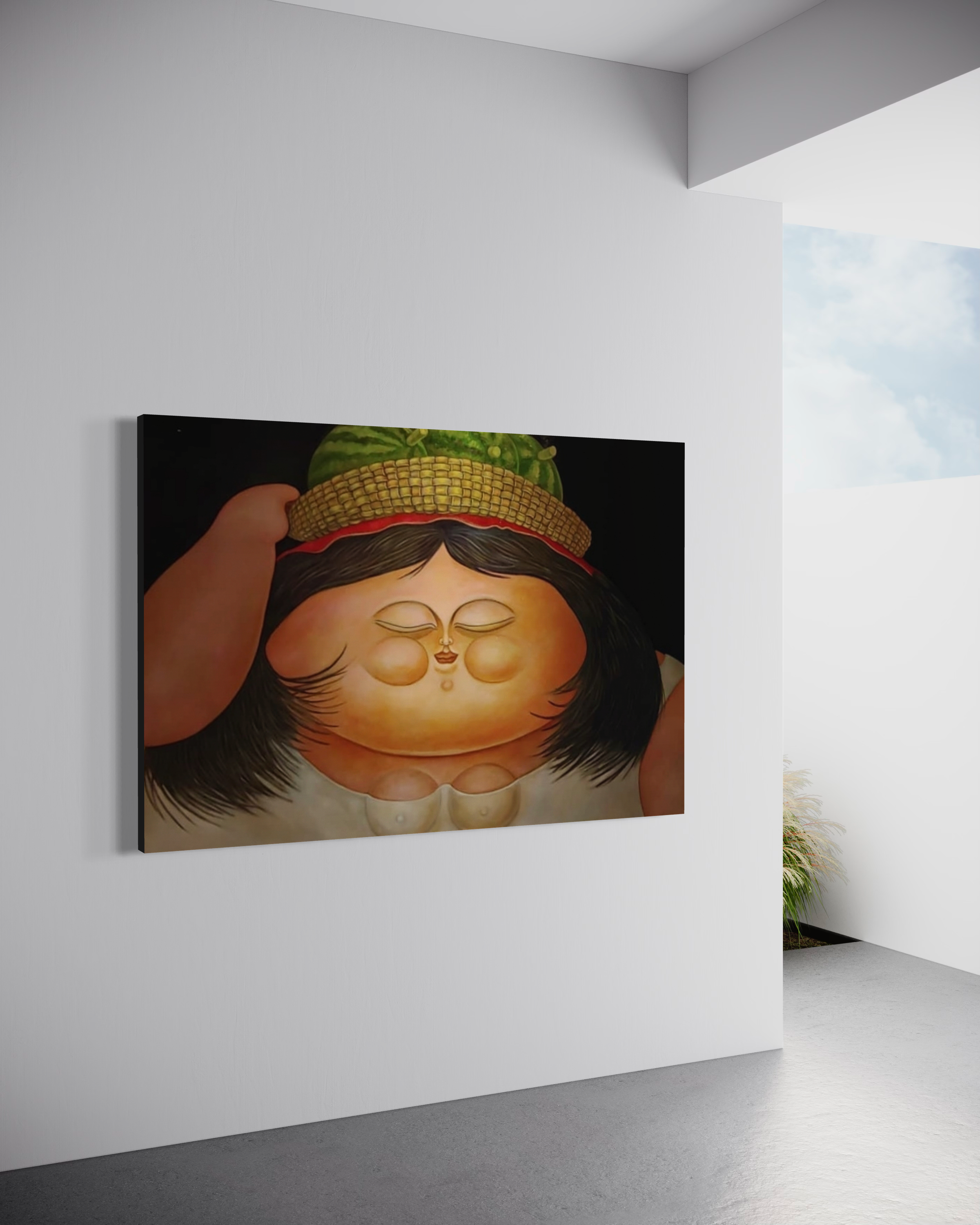 She carries a basket of ripe watermelons atop her head, a symbol of harvest and tradition, anchoring her deeply in the rhythms of rural life. The exaggerated proportions and whimsical expression lend the piece a folkloric charm, reminiscent of stories passed down through generations. Her strength is quiet but undeniable, a tribute to the women who bear the weight of culture and sustenance with grace.