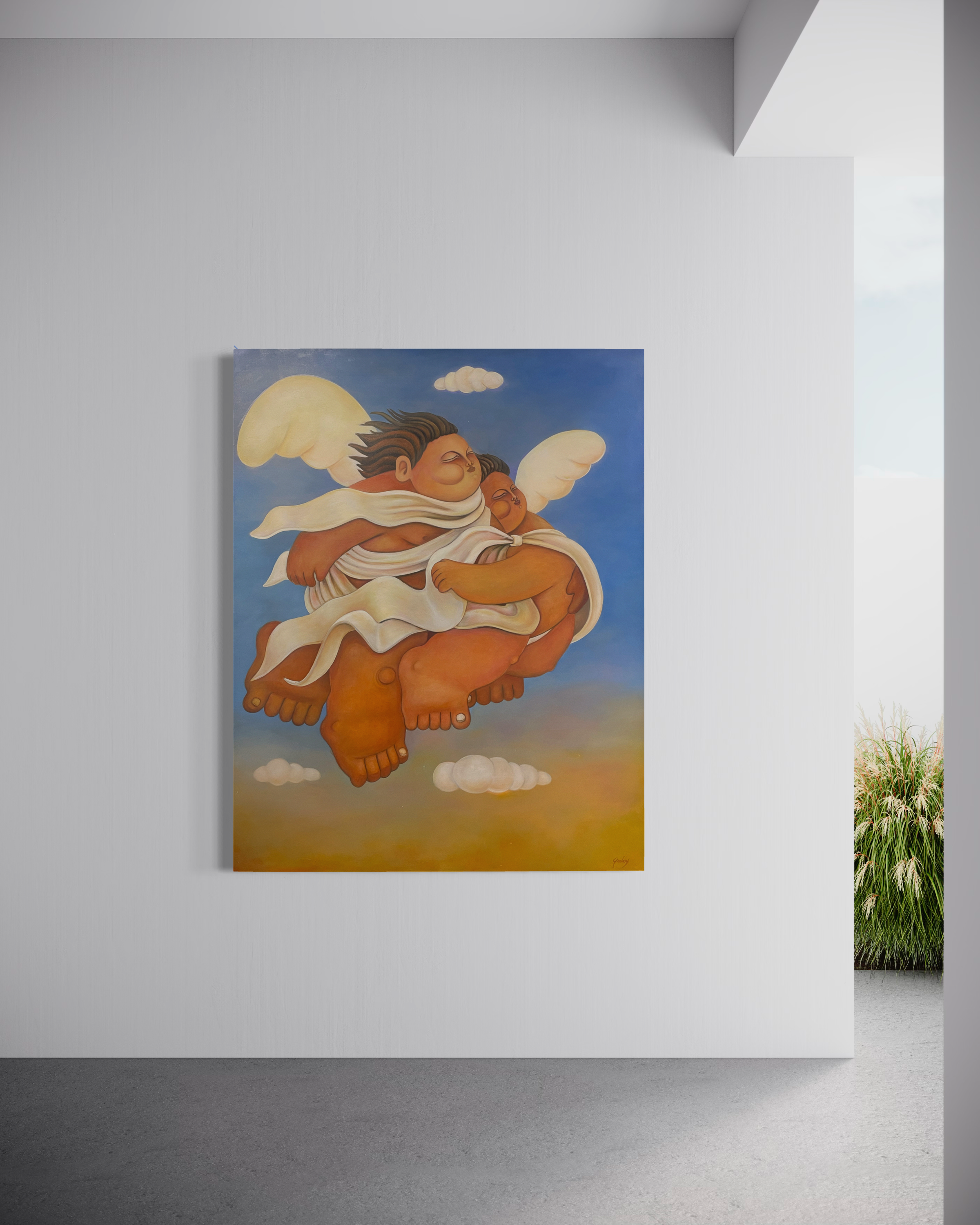 With closed eyes and tranquil expressions, the central angel embraces a smaller companion in a tender gesture of guidance and love. Their powerful wings unfurl behind them, feathered in soft creams that catch the light like clouds in motion. The scene is both grounded and fantastical—heavenly beings depicted with a joyful physicality that feels unmistakably human.