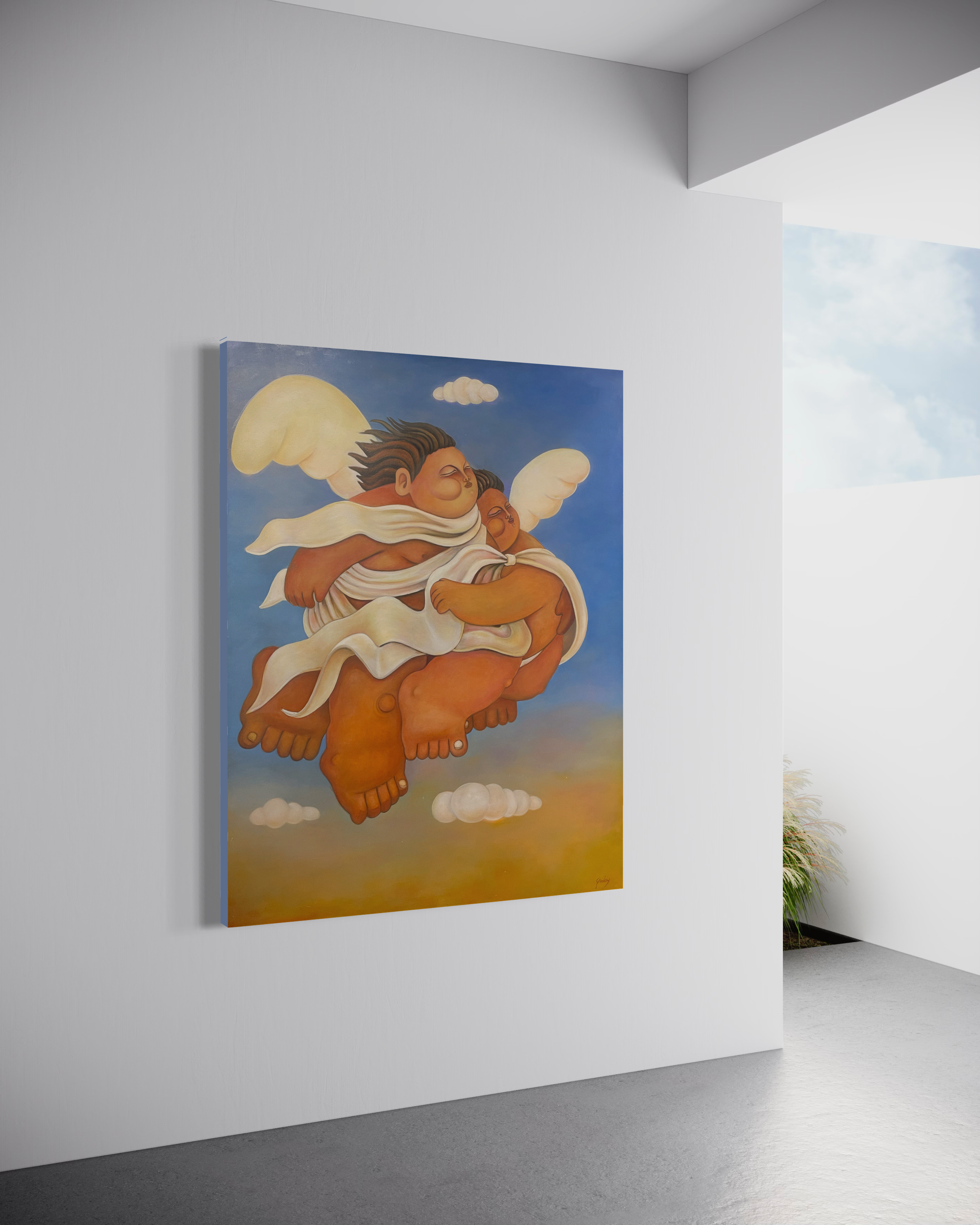 A luminous and heartwarming celebration of celestial grace and human tenderness, suspended in a sky of infinite possibility. In this evocative piece, two angelic figures with softly rounded forms float serenely through a radiant expanse of blue and gold.