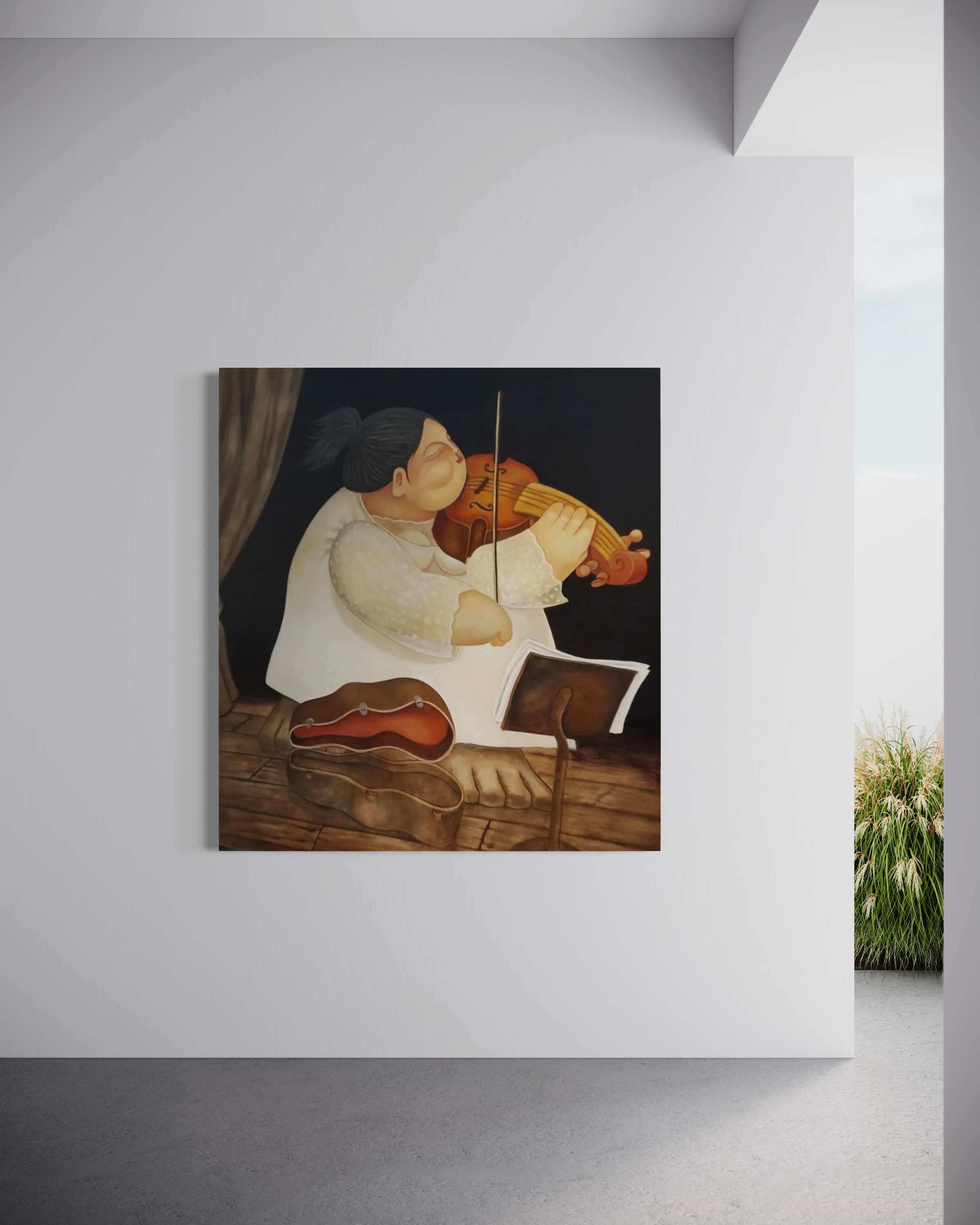 A whimsical and tender portrayal of musical devotion, rendered in a unique, almost dreamlike style. Her eyes are closed in a state of gentle concentration, lips slightly pursed in harmony with the melody she conjures. The violin, painted in warm amber and red tones, radiates as the heart of the composition, a conduit for expression and soul. Below her, an open violin case lies on a wooden floor, inviting us into the scene as silent observers of a personal moment made public.